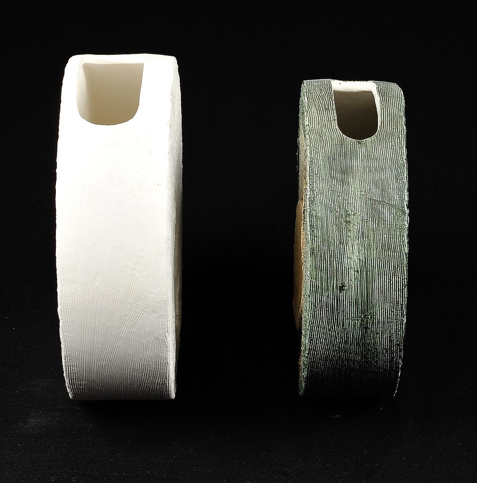 The vase on the right is a finished version of the unfired vase on the left.