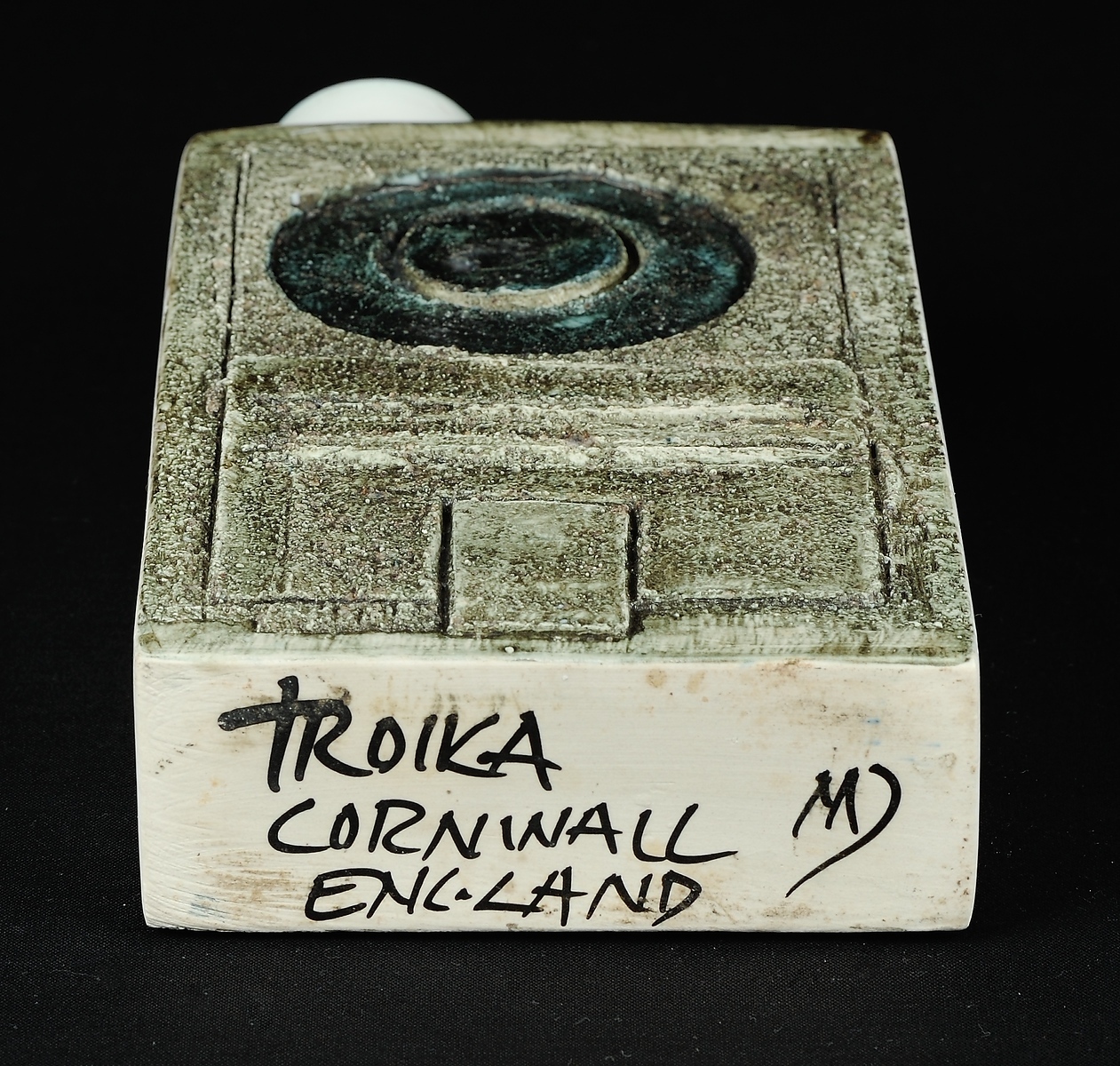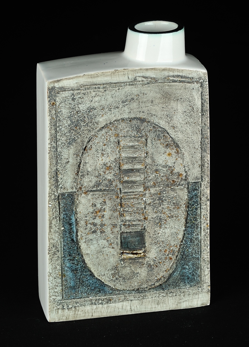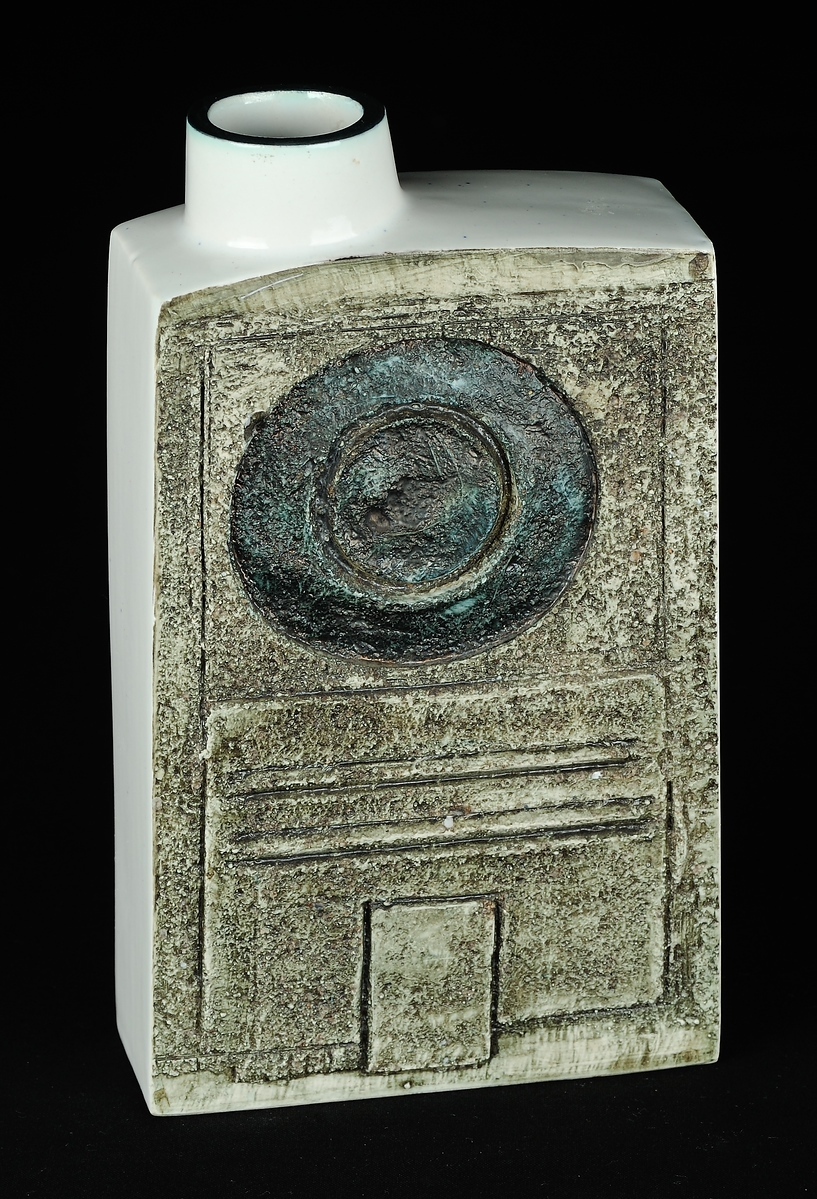 This chimney vase has smooth glazed sides and was decorated by Marilyn Pascoe. This vase from my collection stands 8 inches (about 203 mm) to the top of the opening. It is about 4.625 inches wide (about 117 mm) at the base and 4.375 inches wide (about 111 mm) at the top. It is 1.75 inches thick.